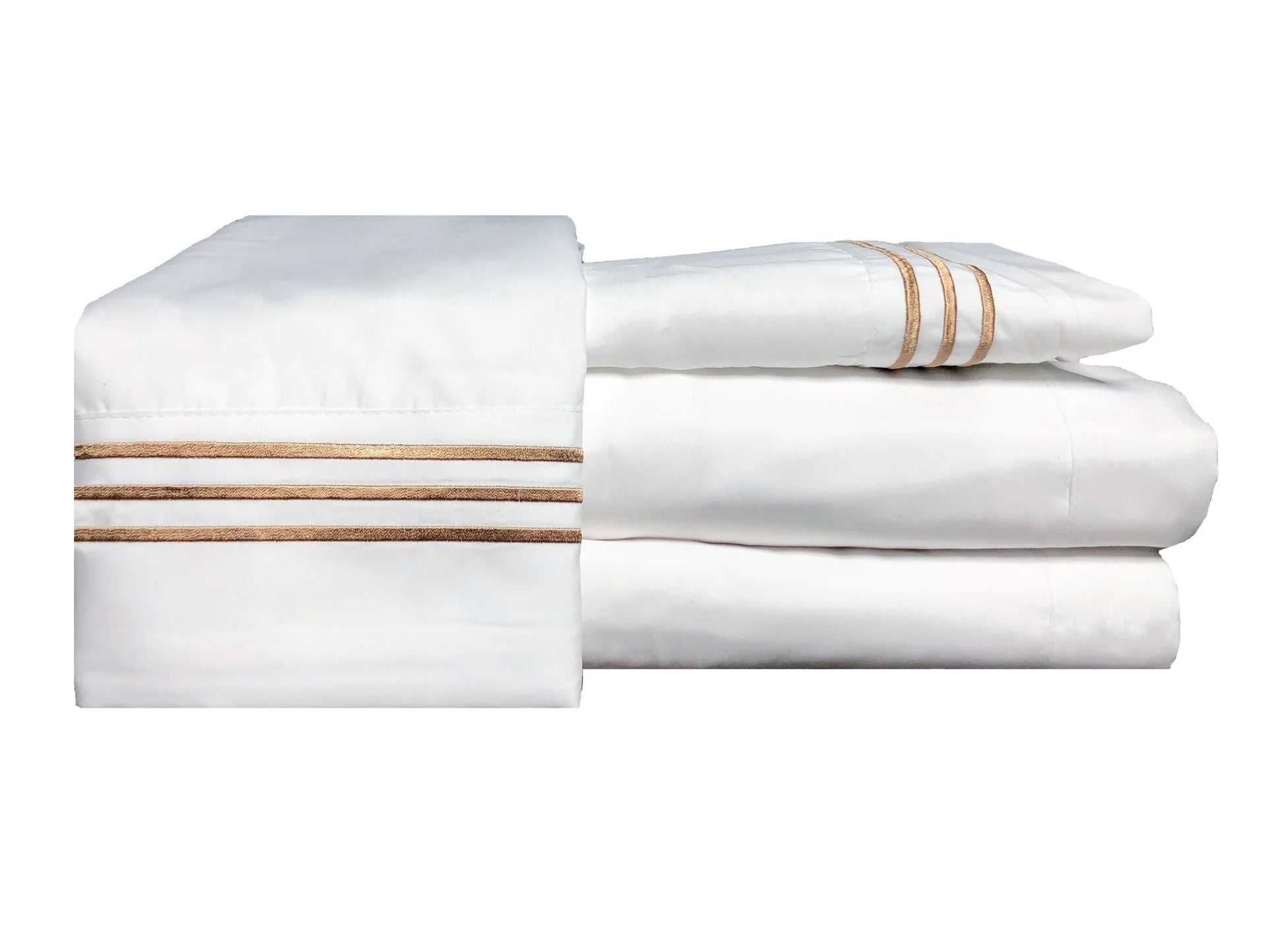 Set de sábanas lisas de microfibra de 1800 hilos con líneas doradas bordadas en fundas de almohadas.