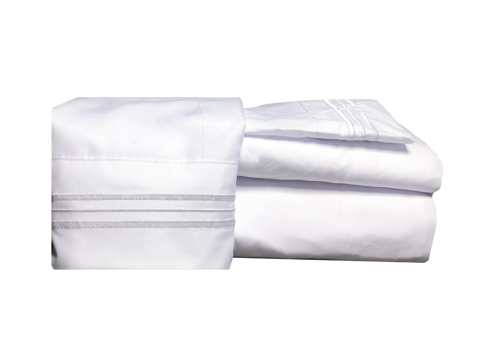 Set de sábanas lisas de microfibra de 1800 hilos con líneas bordadas blancas en fundas de almohadas.